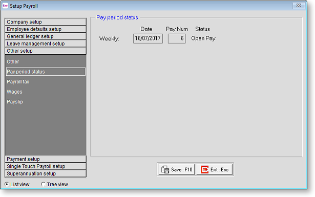 The fields in this sub-section are automatically derived from payroll activity. This involves current pay period dates for all of your pay frequencies, and their corresponding pay numbers. Every time you open a new pay period it is given a new number, starting at 1 and increasing. This window also shows if the pay period is still open or has been updated.