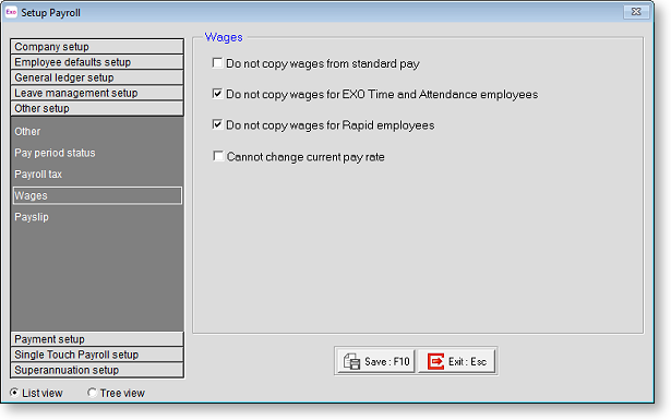 Do not copy wages for Exo Time and Attendance employees Selecting this option means that when you create the Other9, the wage lines in an employee's Pay period status0 will not be copied into the Current Pay if they have been tagged as a Time and Attendance employee. (Everything else will, just not the contents of the Pay period status1.) This is only to be switched on if you are entering current pay information via MYOB Exo Time and Attendance. It is to ensure that you do not double up wage/hours information with what may be in the employee's Standard Pay.