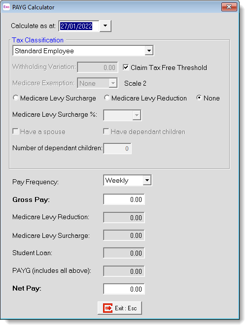 Exo Payroll includes a useful PAYG Calculator for calculating the Tax, Net Pay, Student Loan on any amount. This is selected from the Utilities menu or by clicking on the PAYG Calculator button on the toolbar.
