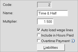 Liabilities Certain pay rate multipliers have an effect on other payment items, e.g. hours paid at ordinary time rates are liable for Superannuation, whereas hours paid at overtime rates are not. Clicking this button opens a window that lets you select the pay items this pay rate multiplier is liable for.