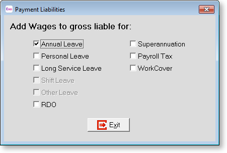 Certain pay items have an effect on other payment items, e.g. Salaries and Annual Leave are liable for Superannuation, WorkCover levies and Payroll Tax, whereas Leave Loading paid on termination is not liable for Superannuation.