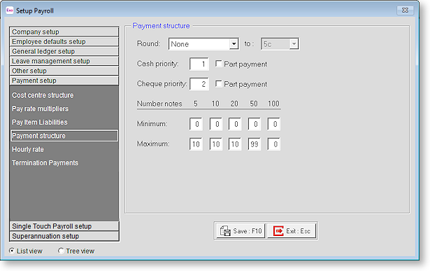 - None - If pay rounding is set to None, the Payroll will automatically round cash pays only, to the nearest 5c. Pay rounding is tracked on the Cost centre structure3 of the Edit Employee window.