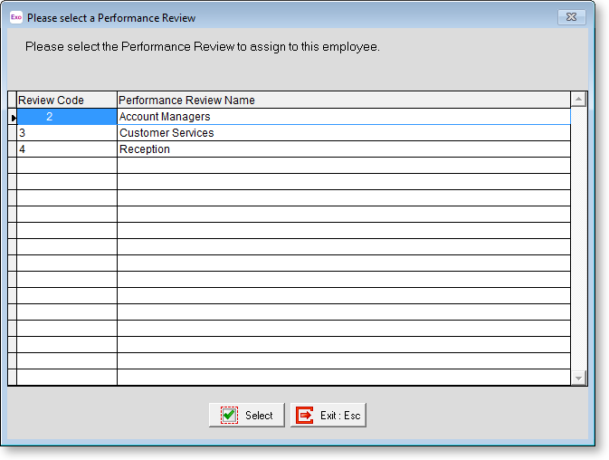 Click the Add button to display a list of all available Performance Review Plans. Highlight a plan that is suited to the employee's requirement and click Select to add it to the Performance Review window.