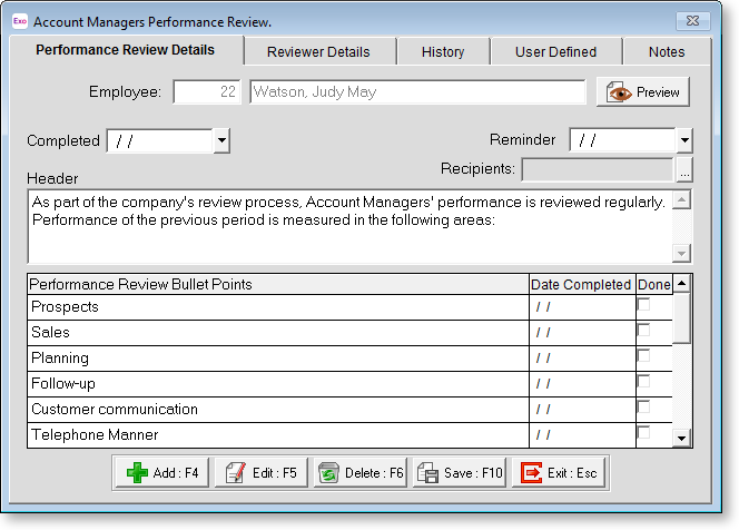 To edit an existing plan, select the plan on the Performance Review window and click the Edit button. This opens the following window: