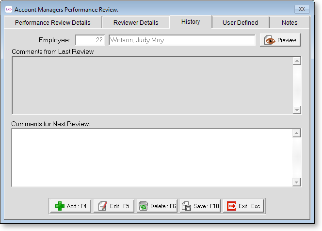 You can use this tab to enter a historical record of any comments that apply from one review to the next.