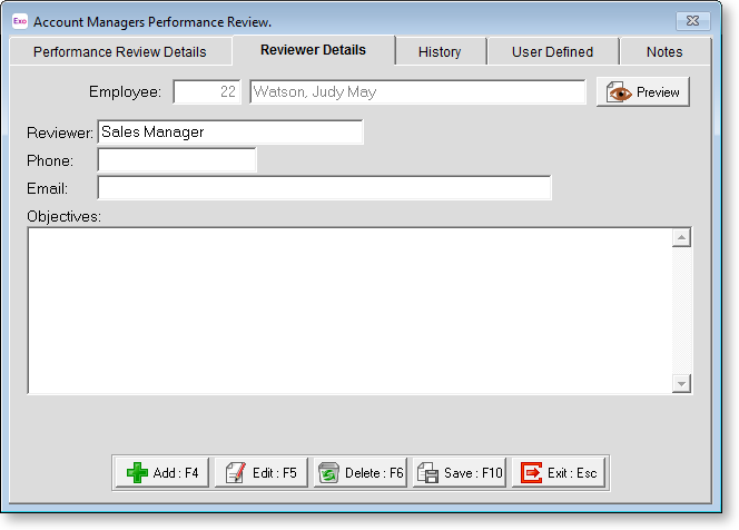 Enter the details of the person who will be conducting the performance review on this tab.