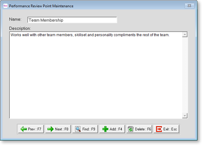 To set up Performance Review Points, select Performance Review > Performance Review Points from the Maintenance menu. A list of points appears. Click Add to create a new point, or highlight an existing point and click Select to edit it. Performance Review Points are added and edited on the following window: