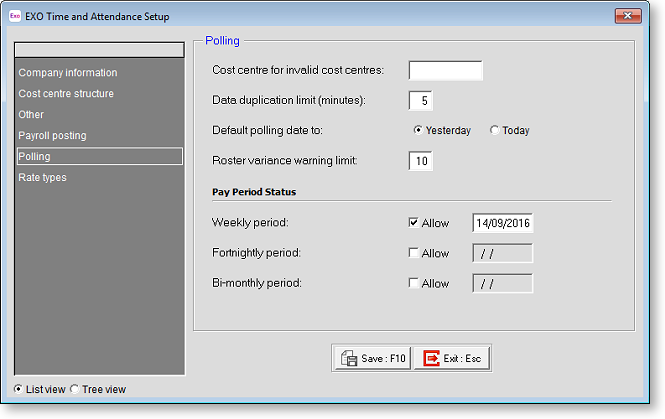 The Polling section of the Exo Time and Attendance Setup window contains settings that affect polling operations.