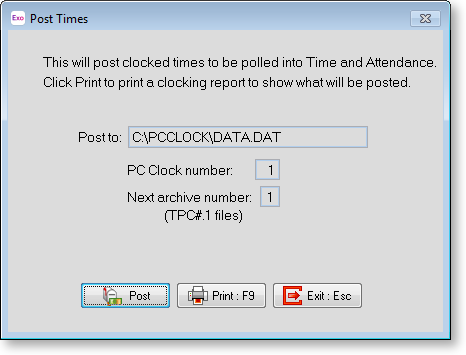 Ensure that the file that Exo Time and Attendance is set to pick up when polling this clock is the same file as you see here (unless it is manually transported - via disk or email for example). From the Exo Time and Attendance Utilities menu, choose TimeClock Setup, press F9 for a list of clocks, and select your PC Clock number. The Time File Name should match that of the Post To field.