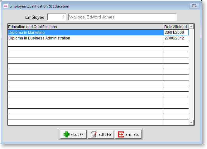 Clicking this button displays a list of the qualifications already recorded for the employee; initially this list will be empty.
