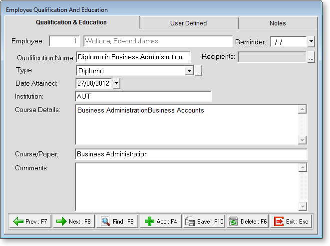 By creating a database of qualification options and then assigning these at the employee level this can become an easily managed area providing valuable information to assist in your organisation's human resource planning.