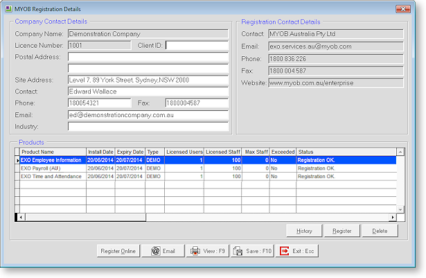 This section displays contact information for your company. Before you send registration information to MYOB please update your contact details if they have changed, so that we can stay on touch with you. The contact person is particularly important to us, as it is the most likely to change.