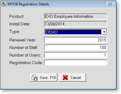In Demonstration Mode the system will allow one month of trial use before requiring registration. Once you have contacted your MYOB Account Manager or local MYOB Distributor to arrange purchase of the software, you will be incorporated into our MYOB Customer Database and provided with your unique registration file.