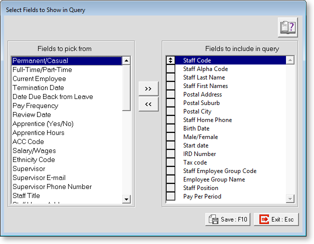 These are the fields that you will see in the final report. To exclude the field from the query, scroll to the appropriate field in the right hand window using the scroll bar in the centre of the screen, and double-click on the field to move it to the left hand window.