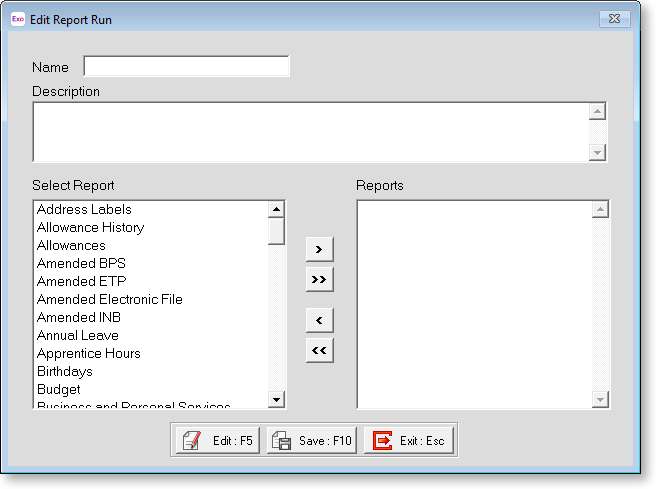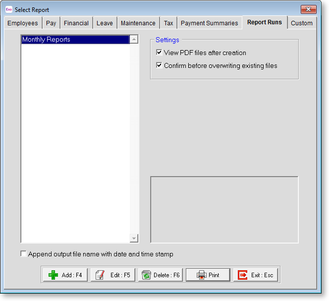 A report run is a way of grouping reports together to process several at a time. This saves the repetitive task of having to navigate to, set up, preview, and print the same reports for pay after pay, from the report selection window.