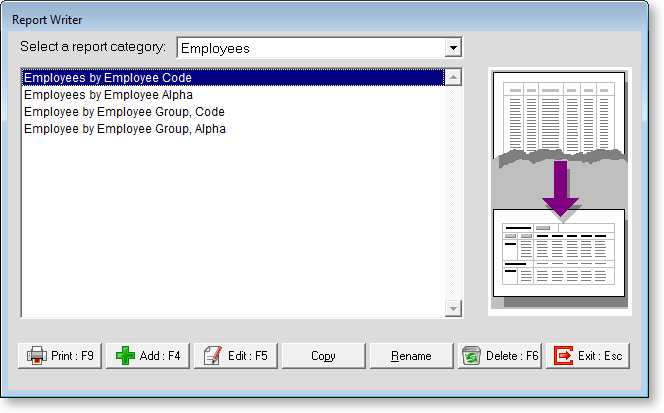 From the Reports menu select Report Writer, the Report Selection screen will appear: