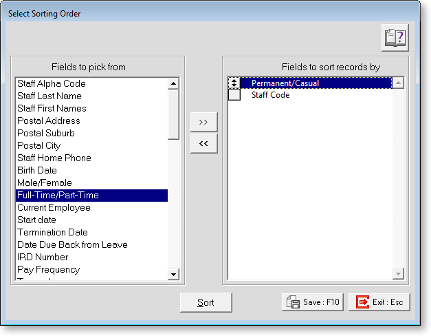 Typical sort orders in MYOB EXO Employee Information would be: