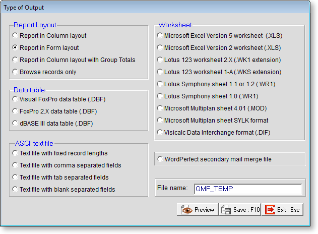 This screen controls the layout of the report if you are outputting to screen, or the file format if you are outputting to file.