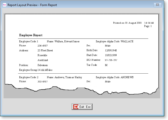 The report type in effect defines the layout of the report, and this is largely a matter of personal preference. Set the output type of your liking and click here to get a preview of Exo Employee Information's interpretation. In this example, the Report in Form layout has been chosen.