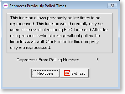 Click Reprocess to perform the reprocessing operation or Exit to cancel and return to the Poll Time Clocks window.
