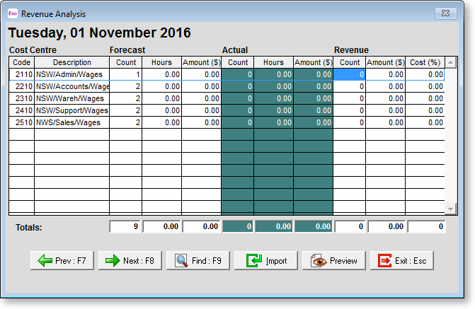 These fields are provided for you to compare your Revenue per cost centre as recorded in a revenue spreadsheet. Revenue data is sourced externally from the Staff Scheduler and is therefore gathered via the Import button.