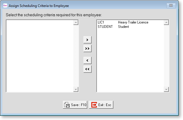 On the left of the screen is a list of all available Scheduling Criteria. On the right are the criteria already associated with this employee.