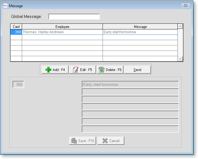 To send a message to all employees that use the timeclock, enter a message into the Global Message field.