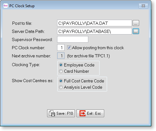 PC Clock number This is mainly used to identify the different clocks and their posting archive files. Try and always use a different number for each copy of PC Clock that you run and if possible match them with the ones in Exo Time and Attendance, as this saves confusion.