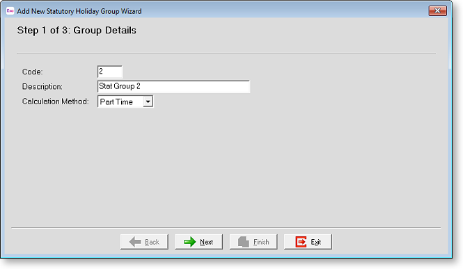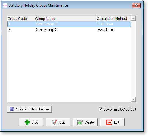 Once you have reviewed the list of public holidays, click the Exit button to return to the Statutory Holiday Groups maintenance screen.