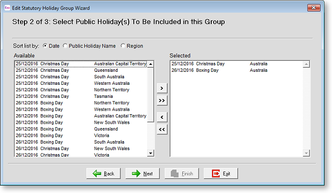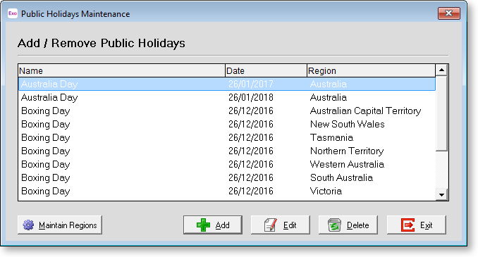 Generally, the most that you would do in this screen is to untick any states that you do not pay wages in. Click the Exit button to return to the Add/Remove Public Holidays window.
