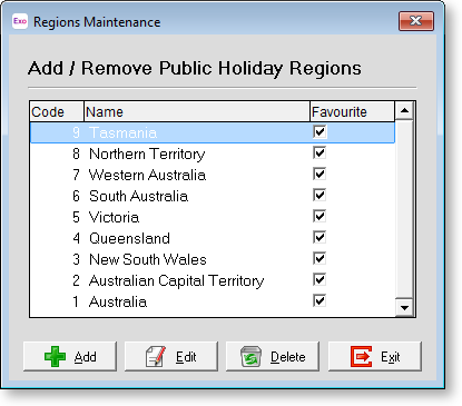 It can be useful to classify public holidays by their regional observance, as not all public holidays are recognised in all provinces/states. Click the Maintain Regions button to set up the regions used by the system: