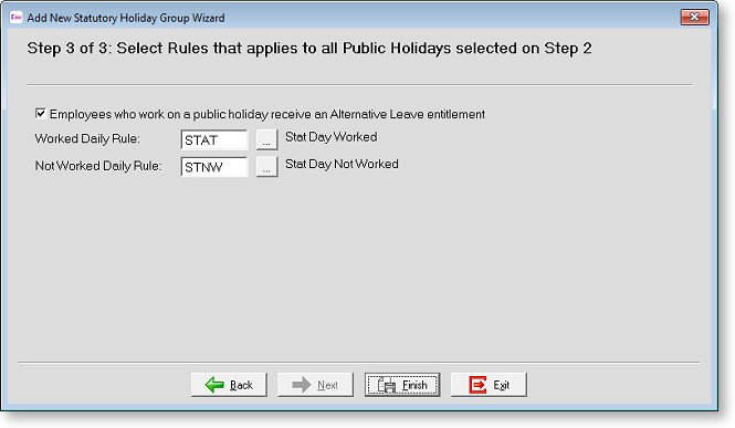 Statutory Holiday Groups use a combination of Daily Rules and Exception Codes to create the payment for the day, and to attract the appropriate leave liability. Statutory Holiday Groups will also automatically accrue an Alternative Day if required.