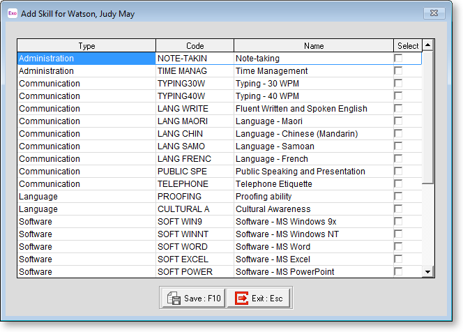 Tick the boxes for all skills you want to add and click Save. The skills are added to the list on the Employee Skills window.
