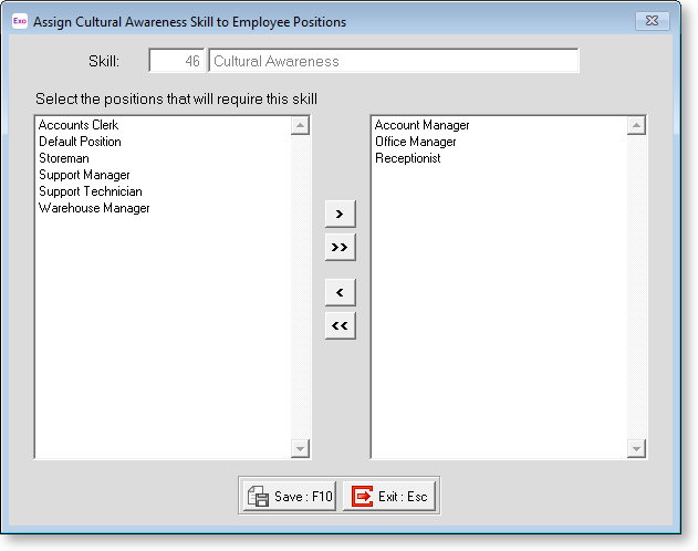 All unassigned positions/groups are listed on the left; all positions/groups that the skill is assigned to are listed on the right. You can click on items and drag them from one list to the other.