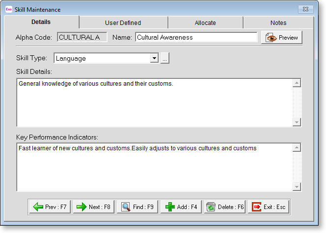 MYOB Exo Employee Information lets you keep a database of skills that can be assigned to employees. This is an optional part of the system. The importance of monitoring skills is based entirely on each companies particular requirements; however, if it is important to be able to manage skill levels, keeping track of employee skills can prove to be a valuable tool in managing your organisation's Human Resource requirements.