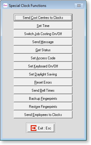 The Special Clock Functions option on the Poll Time Clocks window provides access to a variety of special operations that can be performed on time clocks.