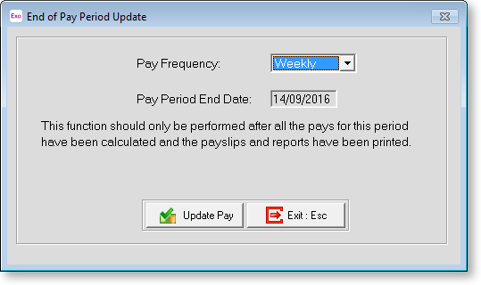 To finalise a pay run, you must update or "close off" the pay period. The pay period should only be updated if all pays have been entered and all reports printed.