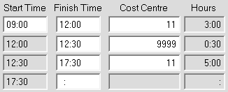 This method requires you to know the start time and the finish time for the day, in order to process times for a day. Key in the start time, and the job cost centre if applicable, then key in the hours worked…