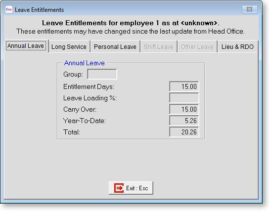 Click the Leave Entitlements button to view the current balance for all leave types relating to the current employee. It is primarily used during the processing of the Current Times for checking that the employee has enough leave entitlement to cover their upcoming absence.