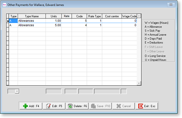 The Other Payments screen is not available for Time and Attendance employees. This is because the Time and Attendance system only accepts data in the form of a times file, and times files only consist of start and finish times.