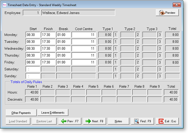 The Standard Timesheet appears. This is where you can maintain standard times for this employee – the equivalent of Exo Payroll's Standard Pay.