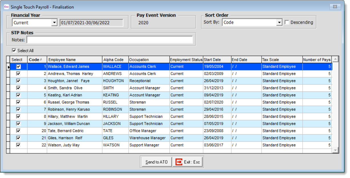 This window lists all employees with pays in the selected financial year, including employees who were terminated during the year. Use the check boxes to select the employees who you want to send finalisation declarations for (or click Select All), optionally enter a note into the STP Notes field, then click Send to ATO.