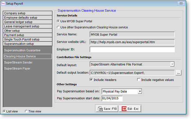 This section contains the details of the superannuation clearing house service that you will use to process superannuation contributions. By default, Exo Payroll uses the MYOB Super Portal service; if you want to use a different service, select Use other Superannuation Clearing House service and enter the service's details below.