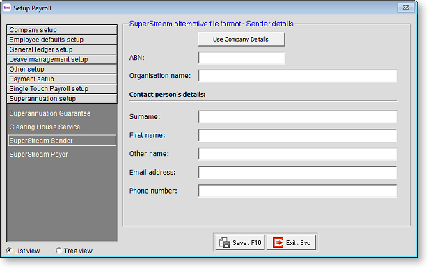 The Superannuation Setup section of the Setup Payroll window contains details relating to employees' superannuation payments, including details that must be supplied when uploading employee details or employee contributions to the SuperStream superannuation management system. Settings are divided across the following sub-sections: