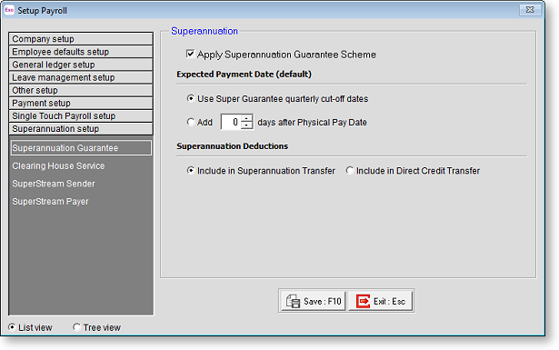 Apply superannuation guarantee scheme Selecting this option applies the Superannuation Guarantee Scheme threshold for all reports. This means that employees who have earned less than the threshold for the month are not eligible for employer superannuation.