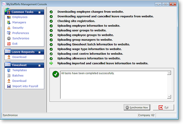 From the Common Tasks pane, select the Synchronise task. The Synchronise screen appears. Click Synchronise Now to download changes made on the website and upload any changes you have made at in the Management Console.