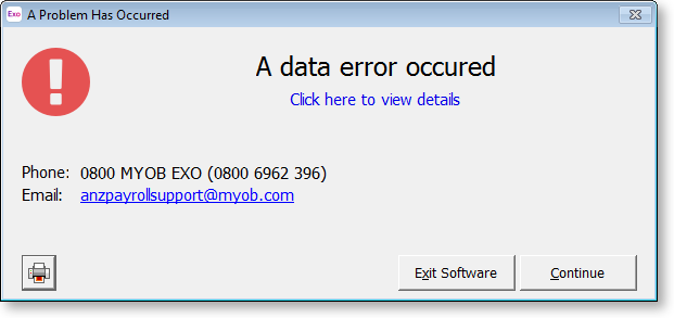 Should this error window ever appear, it is important that you contact MYOB Support immediately with details of what you were doing just prior to it appearing.