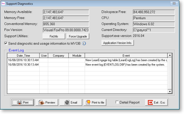Click the Print button to send a Support Report to your default Windows printer. This report can then be faxed to MYOB.