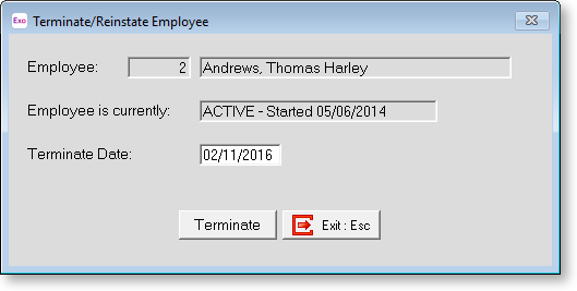 Employees can be terminated or reinstated at any time. To terminate an employee or reinstate a previously terminated employee, select Terminate/Reinstate from the File Menu. You will be asked to select an employee. Enter the code for the employee you want to terminate/reinstate and the following window appears: