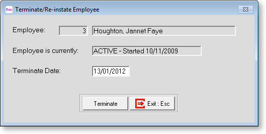 Enter the code for the employee you want to terminate/reinstate and the following window appears: